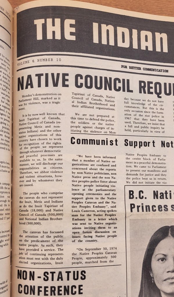 On September 29, 1974, the Native Peoples Caravan arrived in Ottawa. From uprisings that summer at the Two Springs occupation in Secwepemc and the reoccupation of Anishinaabe Park by the Ojibway Warriors Society, the Caravan was joined by people from coast to coast.