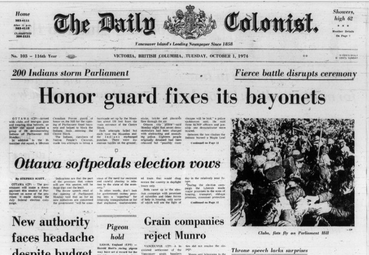 “The clash was between club-swinging, helmet-wearing, riot-trained RCMP and placard-carrying Native men, women, children and non-native supporters, all calling for positive action to end the oppression of Native people in Canada. This incident marked the 30th opening of the Canadian Parliament, the official beginning of the Trudeau government’s rule with a majority of seats in the House of Commons.