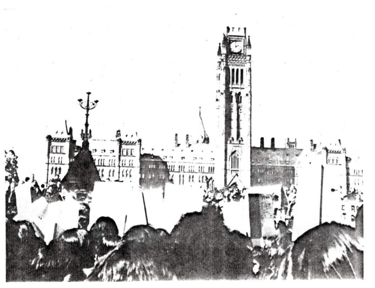 “The violence started when government officials refused to recognize the presence of the demonstrators. The pomp and ceremony of Parliament’s opening continued with few changes in tradition. When the estimated 200 demonstrators reached the stairs on Parliament Hill leading to the Centre Bloc they were stopped by RCMP and wooden barricades.