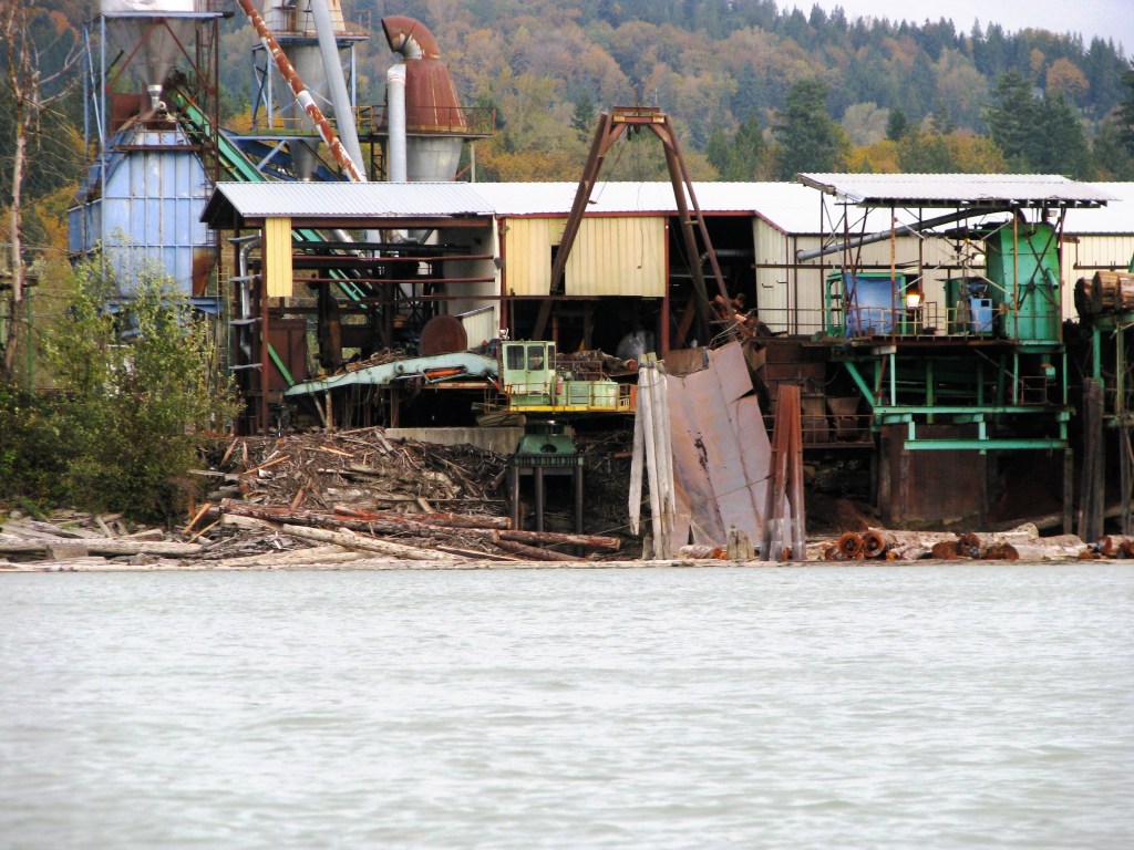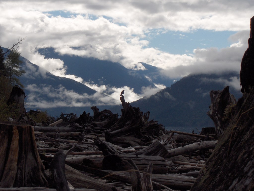 Stumps washed up on the shore of Lillooet Lake where the old people used to use gill nets in the deep water. Extensive clearcut logging on steep slopes further up the valley has led to major erosion and slide events, creating a new bank of accreted land which extends into the lake where the best net fishery used to be.
