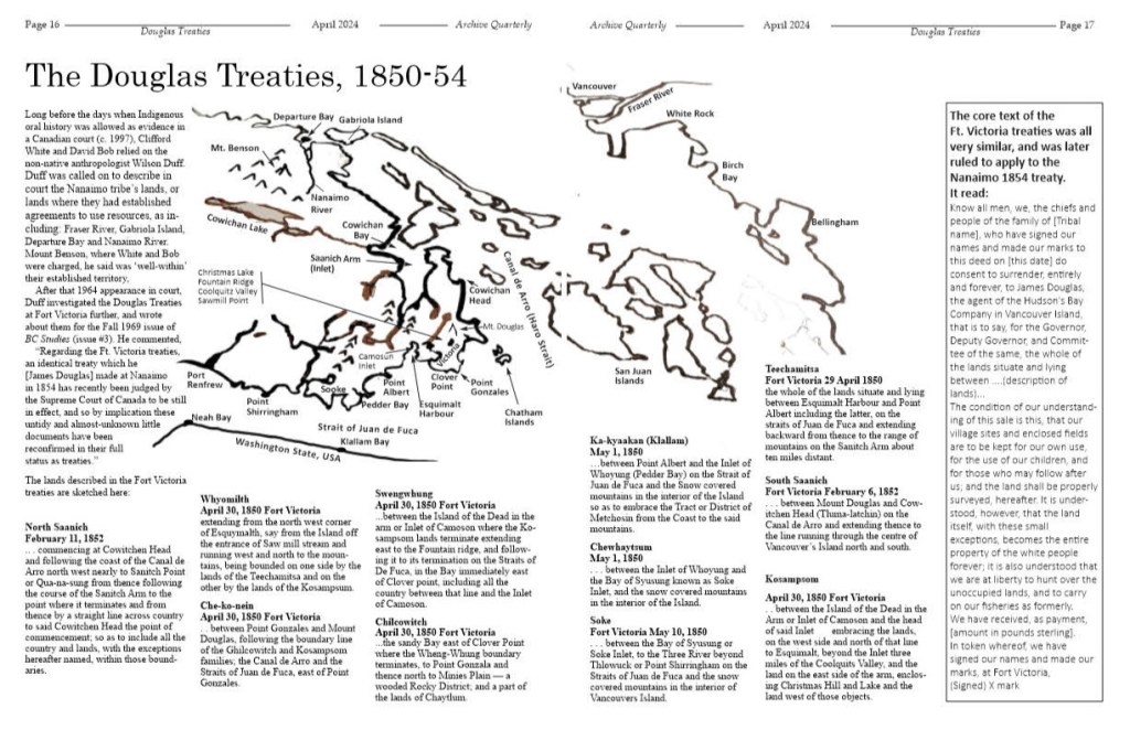 Fourteen land-cession treaties were negotiated between several Vancouver Island tribes and HBC under James Douglas. These were not recognized as treaties by government fish and wildlife officers until the case of White and Bob succeeded in Canadian courts in 1964 and 65. The main provision of the treaties was for the hunting practices and fisheries to “carry on… as formerly.”