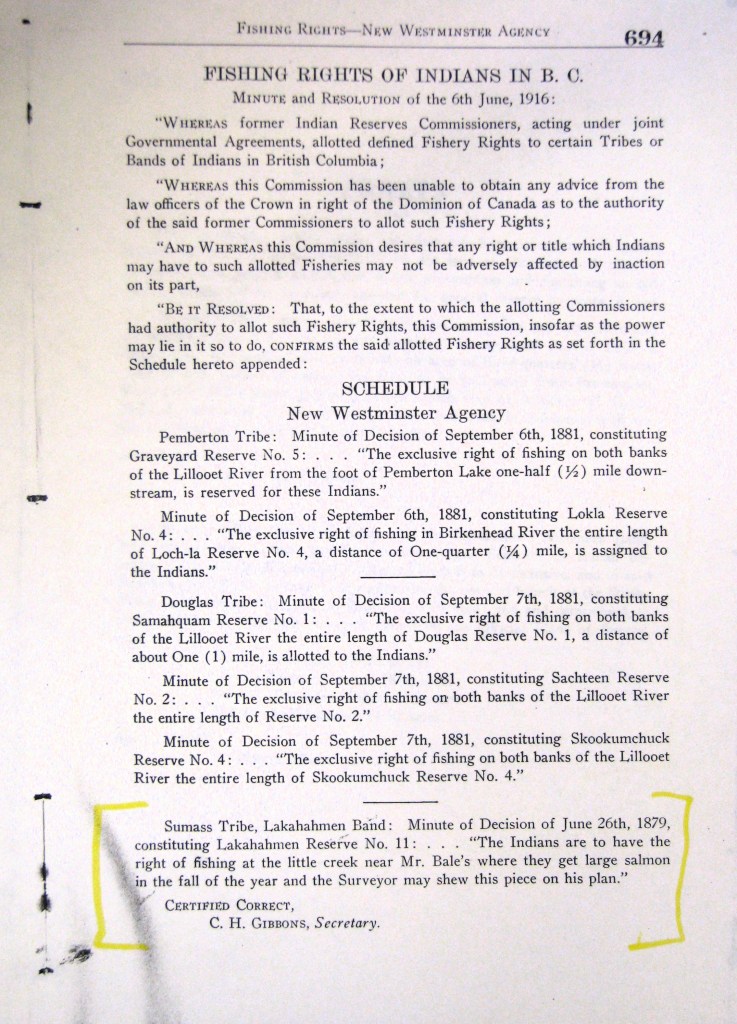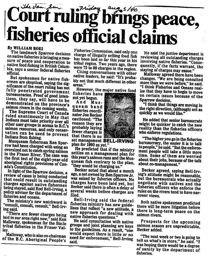 They argued that Article 13 of the Terms of Union (when BC entered confederation with Canada in 1871) protected their right to “a policy as liberal” as previously afforded by the Colony. Before Confederation, the Cowichan’s right to fish without regulation was the Colony’s policy.