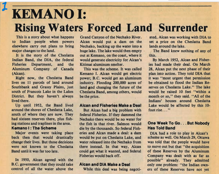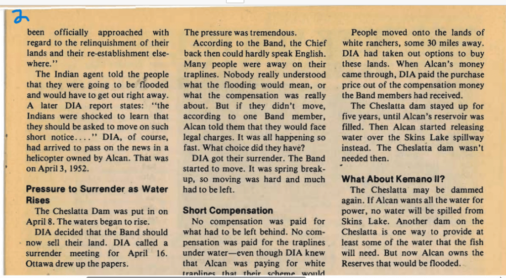 This hydroelectric operation was built to power Alcan’s Kitimat aluminum smelter. The reservoir flooded the Cheslatta People’s sixteen reserves around the shores of what had been Cheslatta Lake, where fishing salmon was a mainstay.