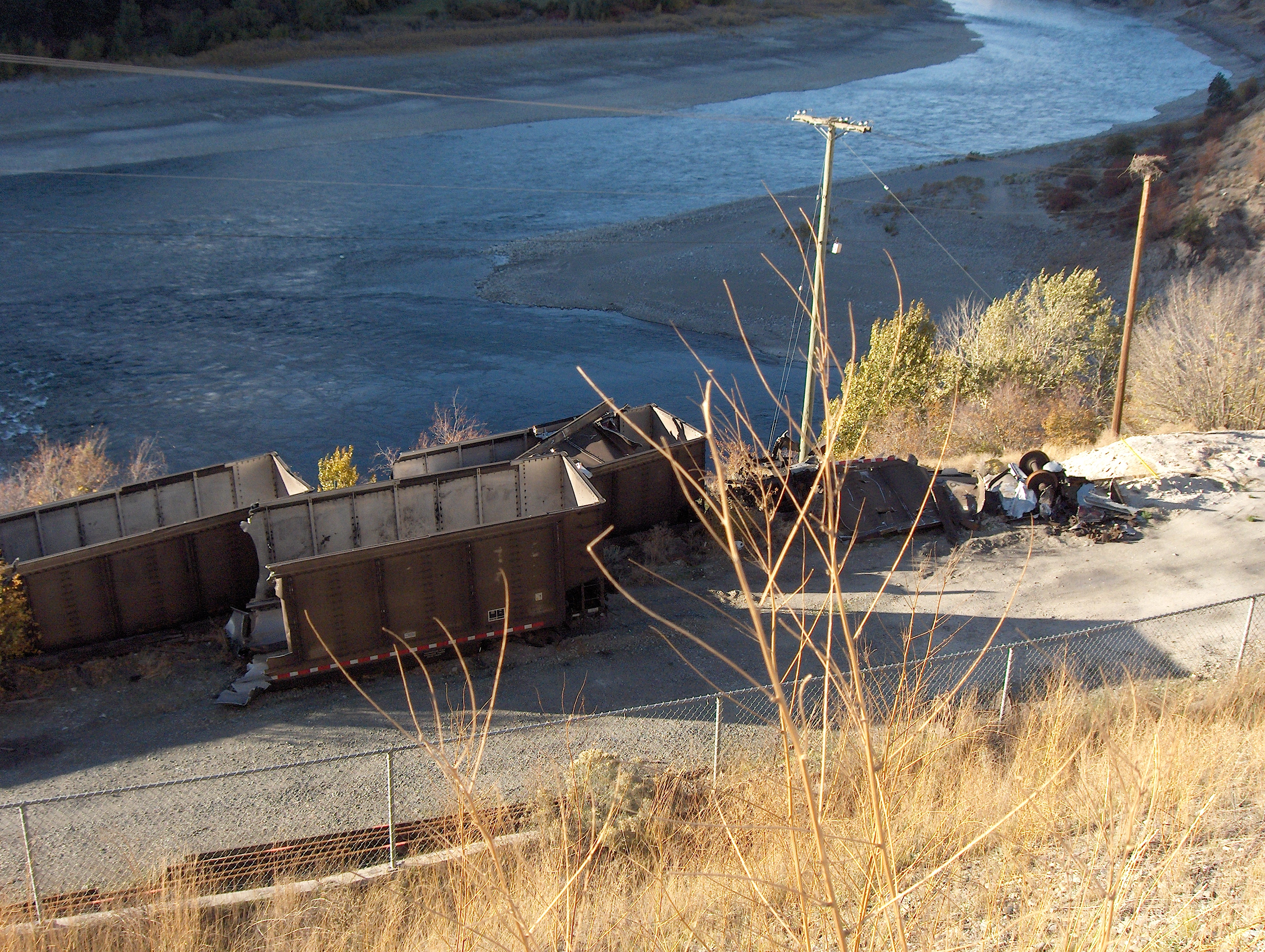 At the confluence of the Thomson and Fraser Rivers, the railway bridge collapsed and several train cars were swept into the Fraser. Food fishing was suspended for the week while fish downstream were tested for coal residue, spilled from the train cars.