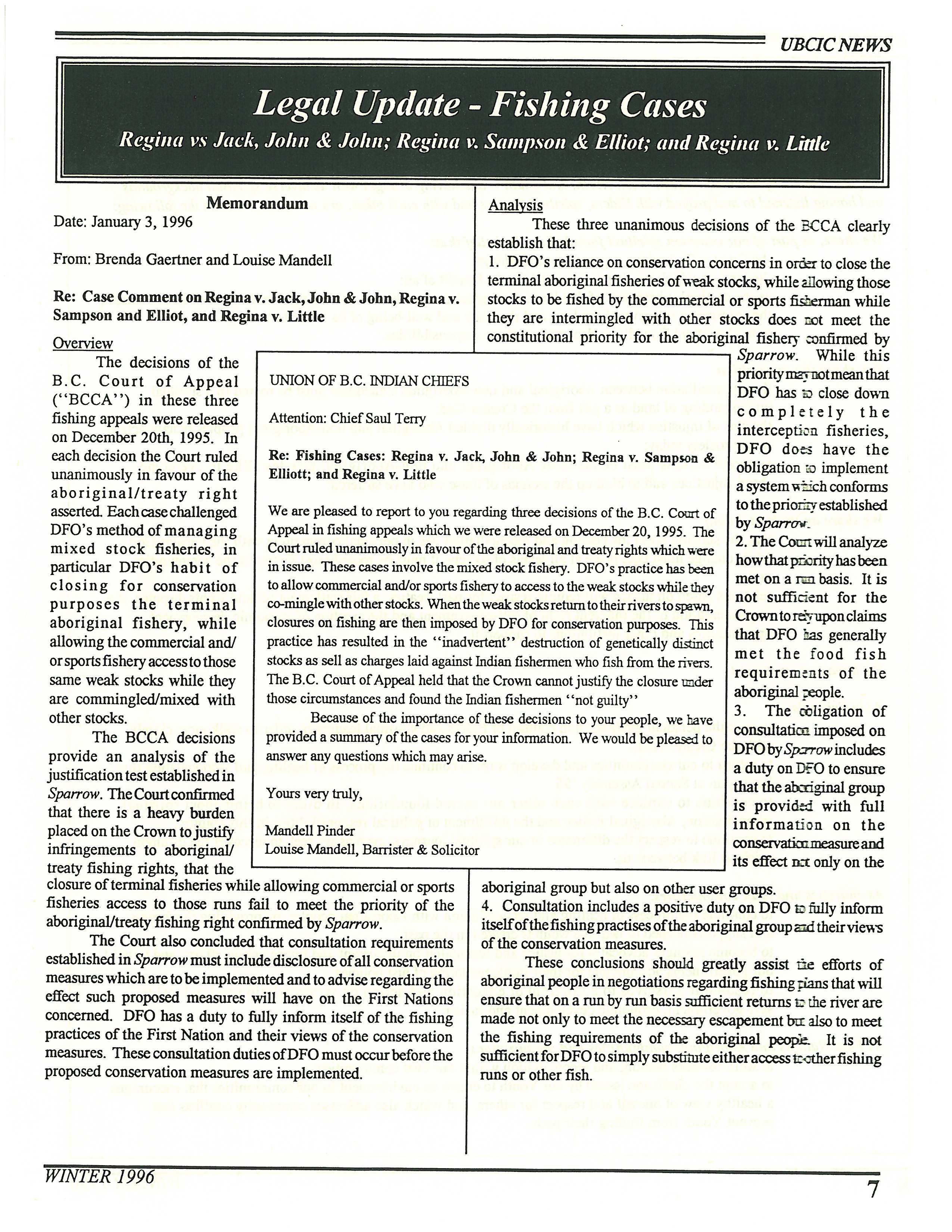“The charge arose out of an incident July 17, 1978, when Lillooet arose Indians defied a 2-day closure on the Stuart Lake run by the Department of Fisheries. Bradley Bob, fishing on the Bridge River Band side of the river, happened to be the one charged. On the Fountain Side, Victor Adolph Junior was charged on the same count, though his charge as well as seven other Lillooet area Indians will be determined by the outcome of the Bob case.”