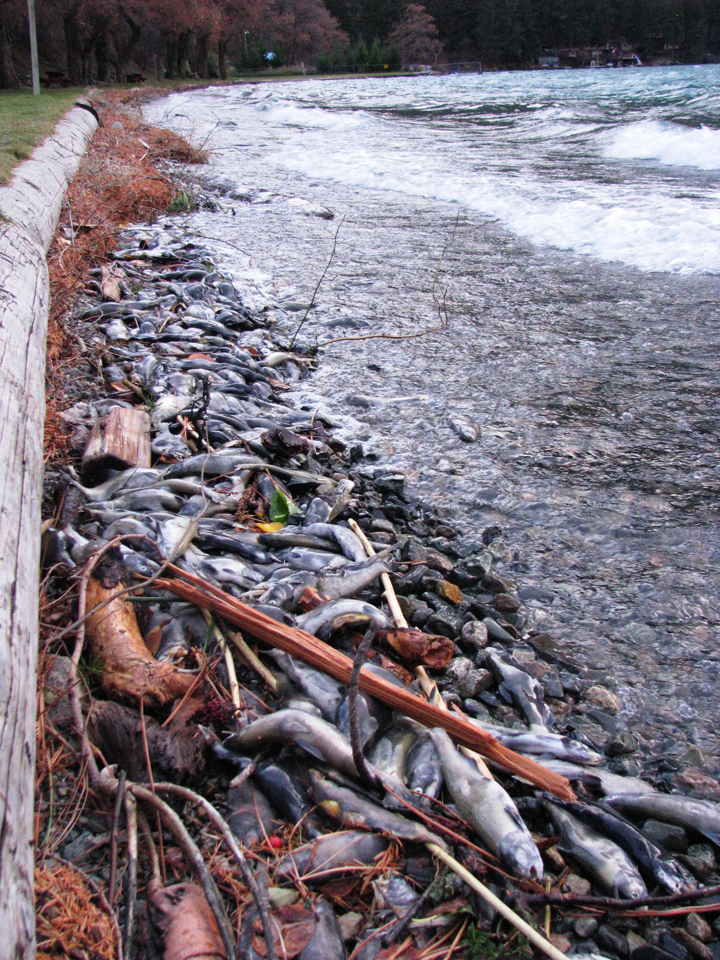 These salmon are landlocked. They are commonly called “Kokanee” salmon. These fish spawn hundreds of feet below the surface, and then float to the surface. The winds across the lake blow them in to shore, in mid-winter – a perfect time for fresh fish!