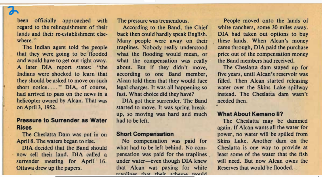 This hydroelectric operation was built to power Alcan’s Kitimat aluminum smelter. The reservoir flooded the Cheslatta People’s sixteen reserves around the shores of what had been Cheslatta Lake, where fishing salmon was a mainstay.