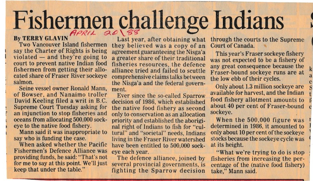 Originating in the Ahousaht Indian Band action, and set back to re-hearing by a subsequent precedent in Lax Kwalaams, this case proceeded to win recognition of Aboriginal rights to fisheries on a commercial scale.