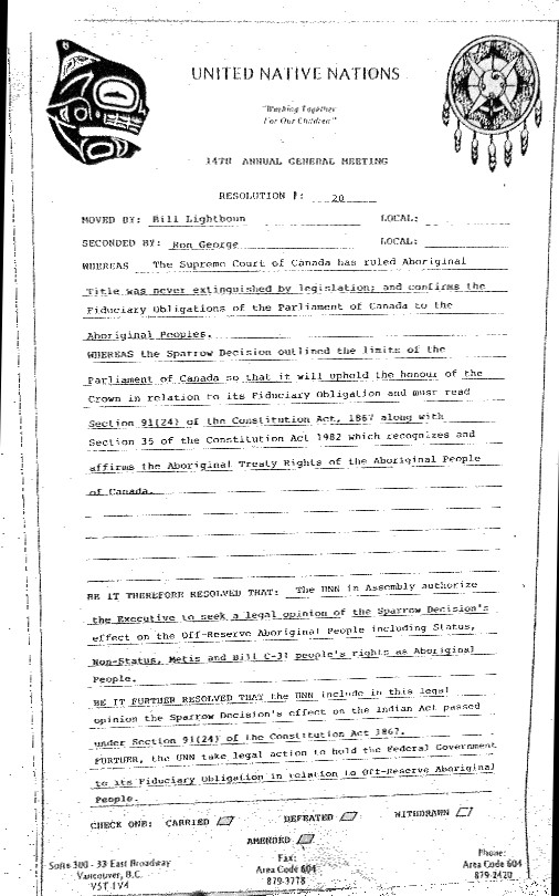 Presented by UNN President Dan Smith. “THE FUTURE: The Year 2000. Your grandchild He asked me, who are you, what Nation do you belong to? What did you say? I said I was a citizen of no Nation. I told him that I was a creation of the Indian Act. Stripped of my identity, my birthright and my citizenship because I could not be legally registered as an Indian. I am a by-product of various pieces of legislation and policies that date back to the 1840’s when the British colonial government formally took steps to assimilate and civilize us; to legislate our Nations out of existence.”