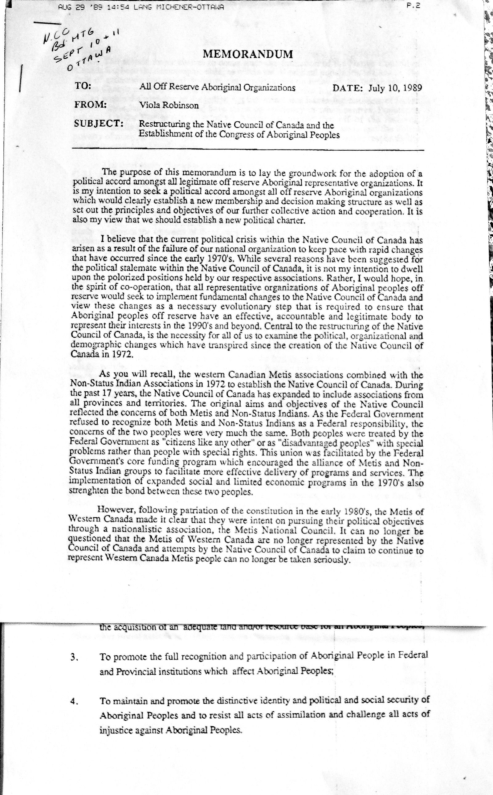 Excerpt: “The Native Council of Canada welcomes this long-overdue opportunity to find our place within Confederation. And as we have said over and over again, our participation in the mainstream of this country must be based on our inherent rights to self-government. participation also requires our full consent. A lot has been said lately about how Canada’s Aboriginal peoples are asking to be given Our inherent right first, and then explain what it means later. This is not quite true. If it helps, let me tell you now what we mean by the word “inherent, ” before it threatens people like the word “distinct” has threatened some people with regard to Quebec society. What we mean by our inherent right to self-government is very simple. By “inherent, ” we mean our rights are inherited. Our rights come from our ancestors, the Creator, from the land itself. Our rights are our inheritance. Unlike non-native Canadians, our rights do not come from European sources.”