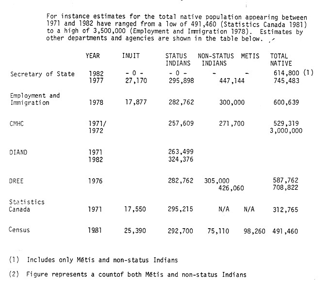 A study commissioned by the Native Council of Canada revealed that the government’s estimations of the populations of Status Indian, Metis, Non-Status Indian, and Inuit Peoples varied by Department, to a gap of 250,000 people in 1971-72. (see image excerpt below).