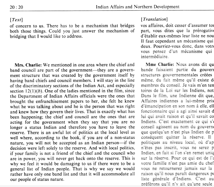 The federal government’s “consultation process” concerning the legislation was dismal. At the end, on March 20, 1985, the parliamentary Standing Committee actually cut off the speakers list addressing Bill C-31 because the vote on the Bill was occurring that afternoon.