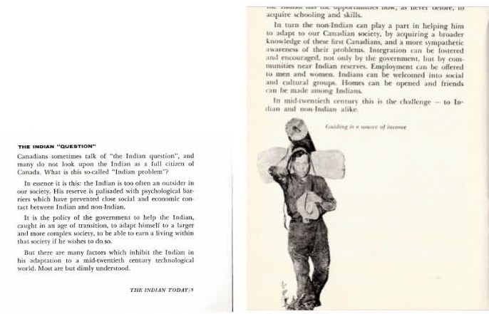 A publication of the Government of Canada. Released in tandem with the Hawthorn Report (a study on off-Reserve Status Indians, and exploration of increasing provincial roles in assimilation, service delivery off-reserve, and dispossession from federal obligations.)