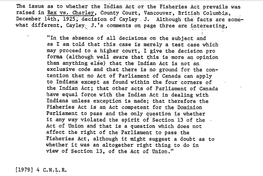 “[1] LASKIN C.J.C.:—On the assumption that Mr. Sanders is correct in his submission (which is one which the Crown does not accept) that there is an aboriginal right to fish in the particular area arising out of Indian occupation and that this right has had subsequent reinforcement (and we express) no opinion on the correctness of this submission), we are all of the view that the Fisheries Act, R.S.C 1970, c. F-14, and the Regulations thereunder which, so far as relevant here, were validly enacted, have the effect of subjecting the alleged right to the controls imposed by the Act and Regulations. The appeal is accordingly dismissed. There will be no order as to costs.”