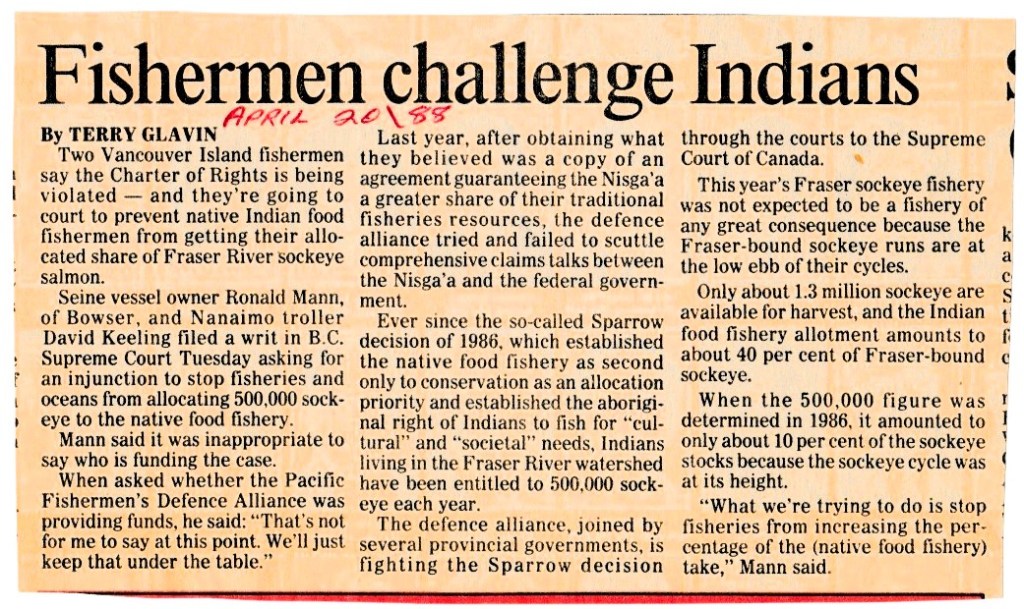 The legal actions that started this case began in 1984, with disputes of logging activity, then an attempt to register claims as property right with the Land Titles registry, in Uukw, 1987.