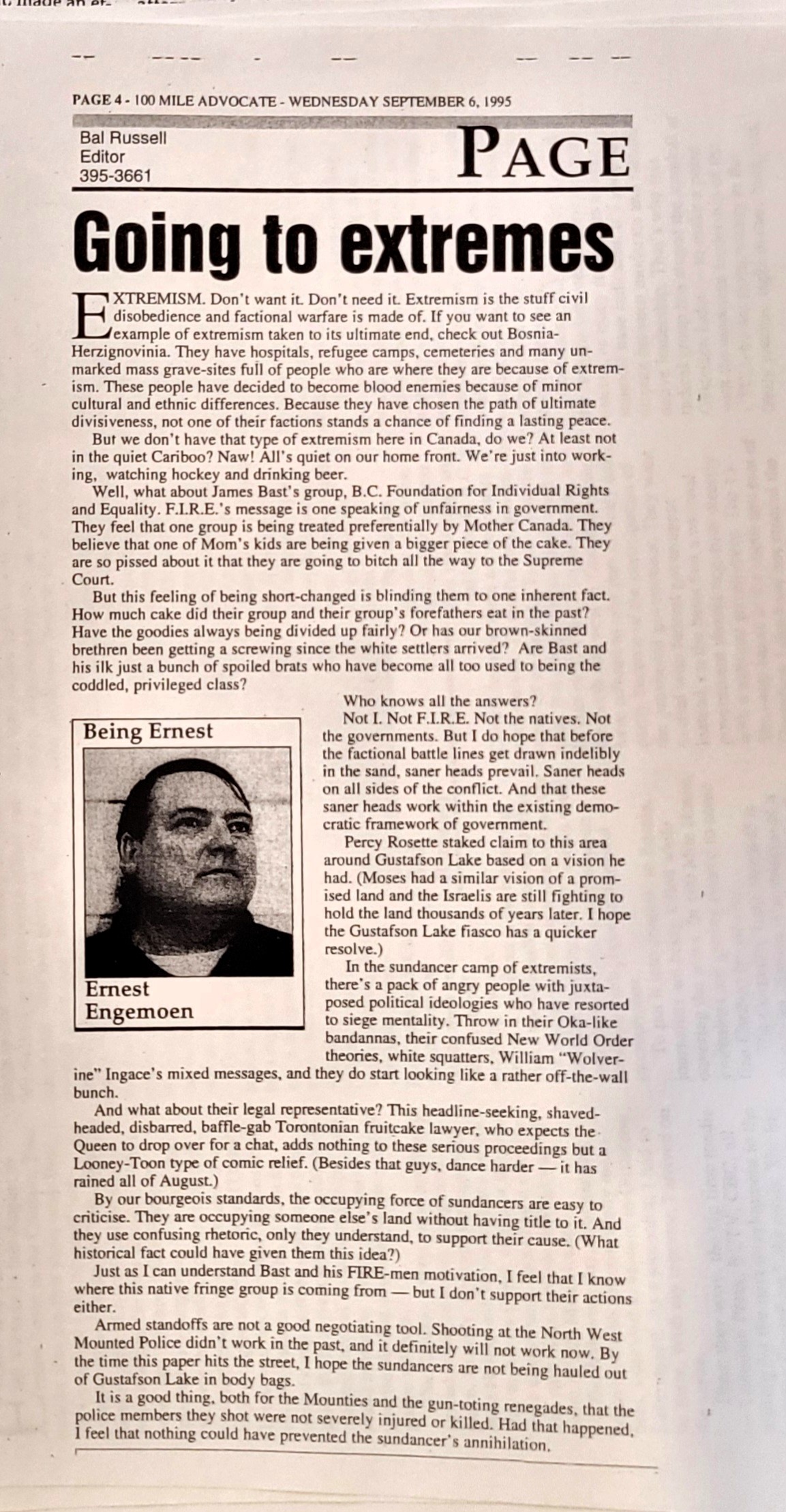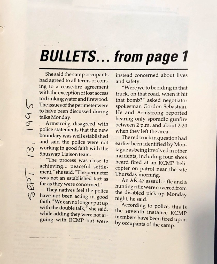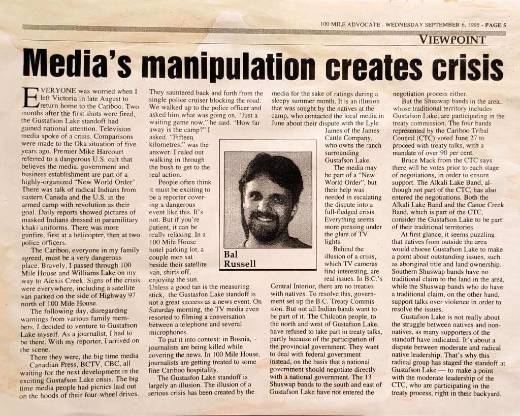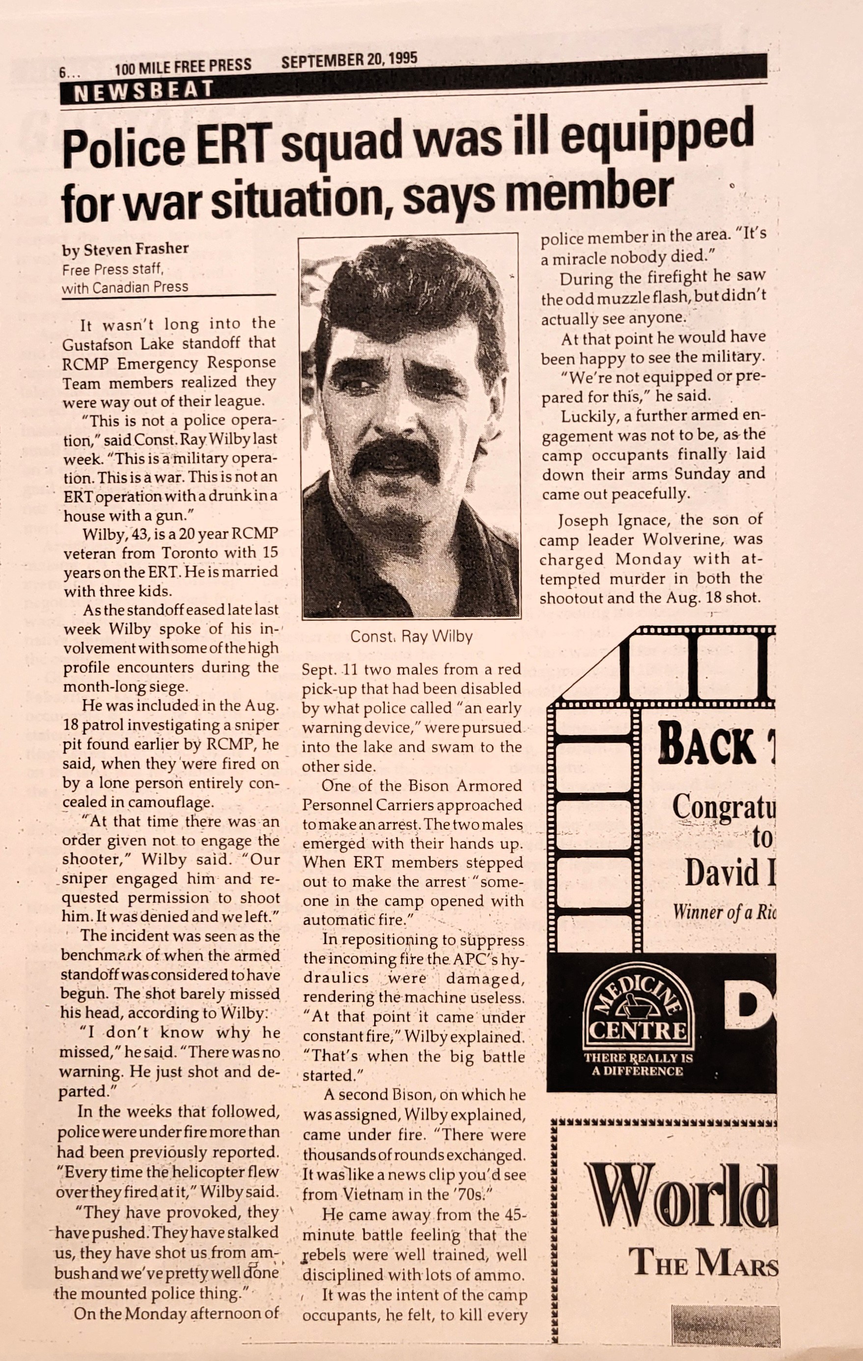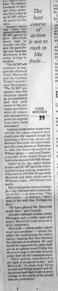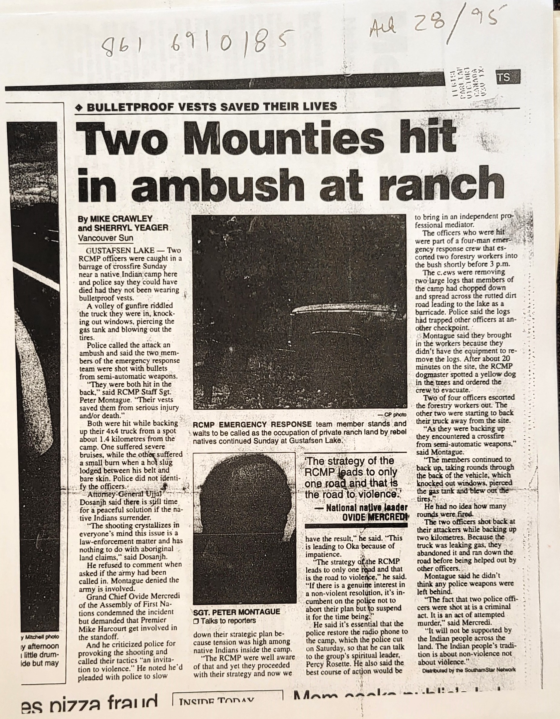 “Something, perhaps my gray hair, tells me that the story of an ‘ambush’ in a ‘hail of bullets’ fired by semi-automatic weapons doesn’t stand up. When an ambush involves crossfire from two sides on unsuspecting targets – the story told by the Mounties – one would expect that someone would get hurt. If there is no wounded Mountie to photograph and show the pictures of, if there is no bullet-torn clothing to hold up at a press conference, I begin to sense that there is more or less to the “ambush” story than what reporters so confidently reported.” (William Johnson, Montreal Gazette, August 29, 1995)