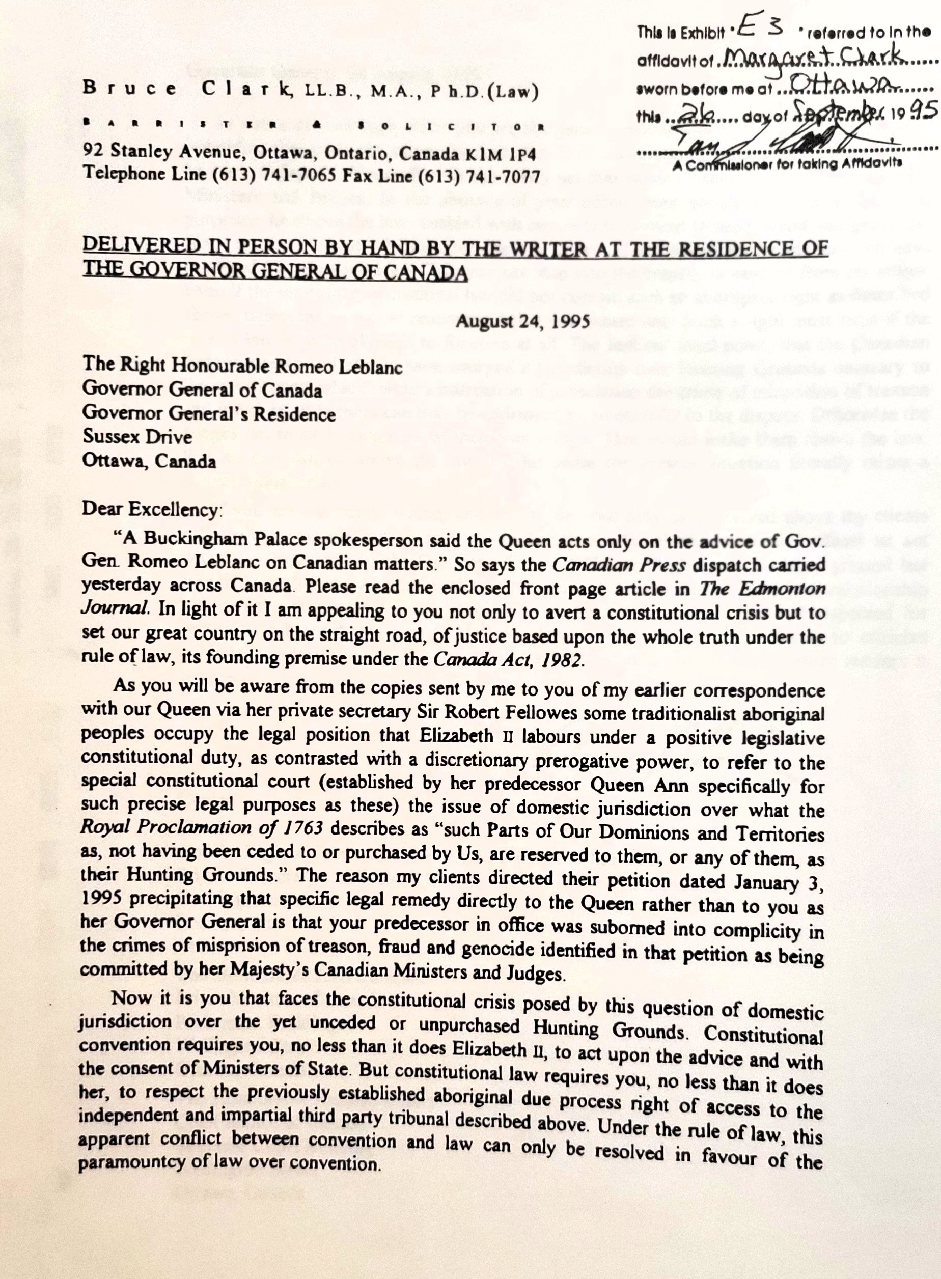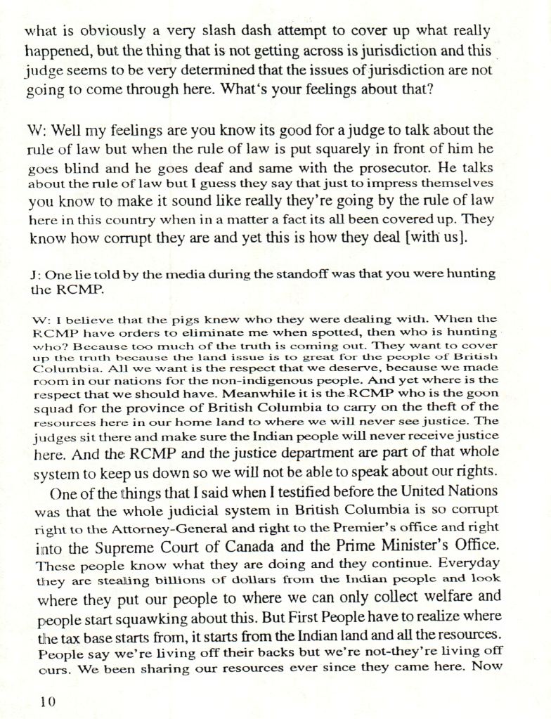 MR. BRUCE CLARK: Well, prima facie, you do not have the general jurisdiction to go into the Indian territories prior to a treaty either. My client’s point of law, which at this point must be conceded at least as being at least arguable, is that in virtue of the invasion of the Indian territories by the court system which this particular panel penultimately represents and the police, this Court has introduced from coast to coast in Canada a murderous situation. It has introduced a situation where every day, police whose presence is prima facie treasonable and fraudulent and arguably genocidal, stays Indian people who prima facie are entitled not to be molested or disturbed, takes those Indian people armed with weapons and on occasion kill them. Now wherever that happens in Canada, it ought to be of concern to this Court if this Court admits that it is arguable that this is an endemic problem.