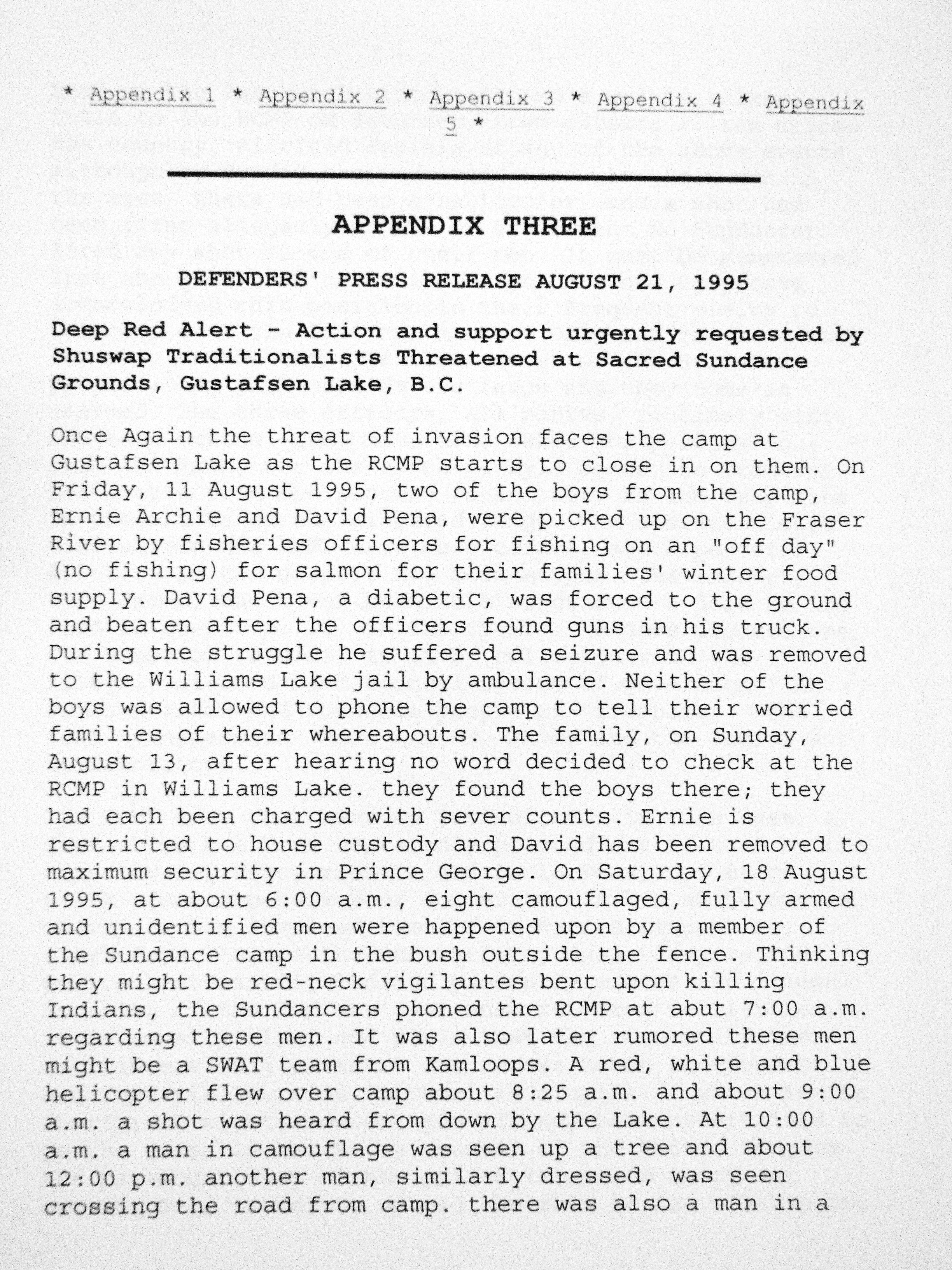 | On July 9, 1996, RCMP Cst. Tassell testified at trial that on August 17, 1995 he was asked to drive five ERT members from the Kamloops RCMP Detachment into the Gustafsen Lake area. Although he remembered the exact time (4:11 pm) when he picked up the ERT members from “a building” and the time he picked them up the next day (at 9:15 am), he could not remember who gave him the orders to drive the team to the Lake. He also had no “direct knowledge” about the information he shared with the ERT members during the hour long drive. Equally puzzling as his memory lapses, this officer, who has been on the force for 23 years, chose these two days of August 17th and 18th (1995) in particular to not take any notes. Cst. Tassell testified that the ERT members were dressed in camouflage with painted faces and armed with assault rifles. He admitted that to the casual observer “they didn’t look like RCMP officers”. When Percy Rosette, the FaithKeeper at the camp, phoned to the RCMP at 6:24 am on August 18th (1995) , fearful of these armed men in the bush, Cst. Tassell admitted that he didn’t call Percy back to reassure him, nor did any other officers do so. – from coverage of the Gustafson trial posted at http://www.sisis.ca – Settlers in Support of Indigenous Sovereignty. |