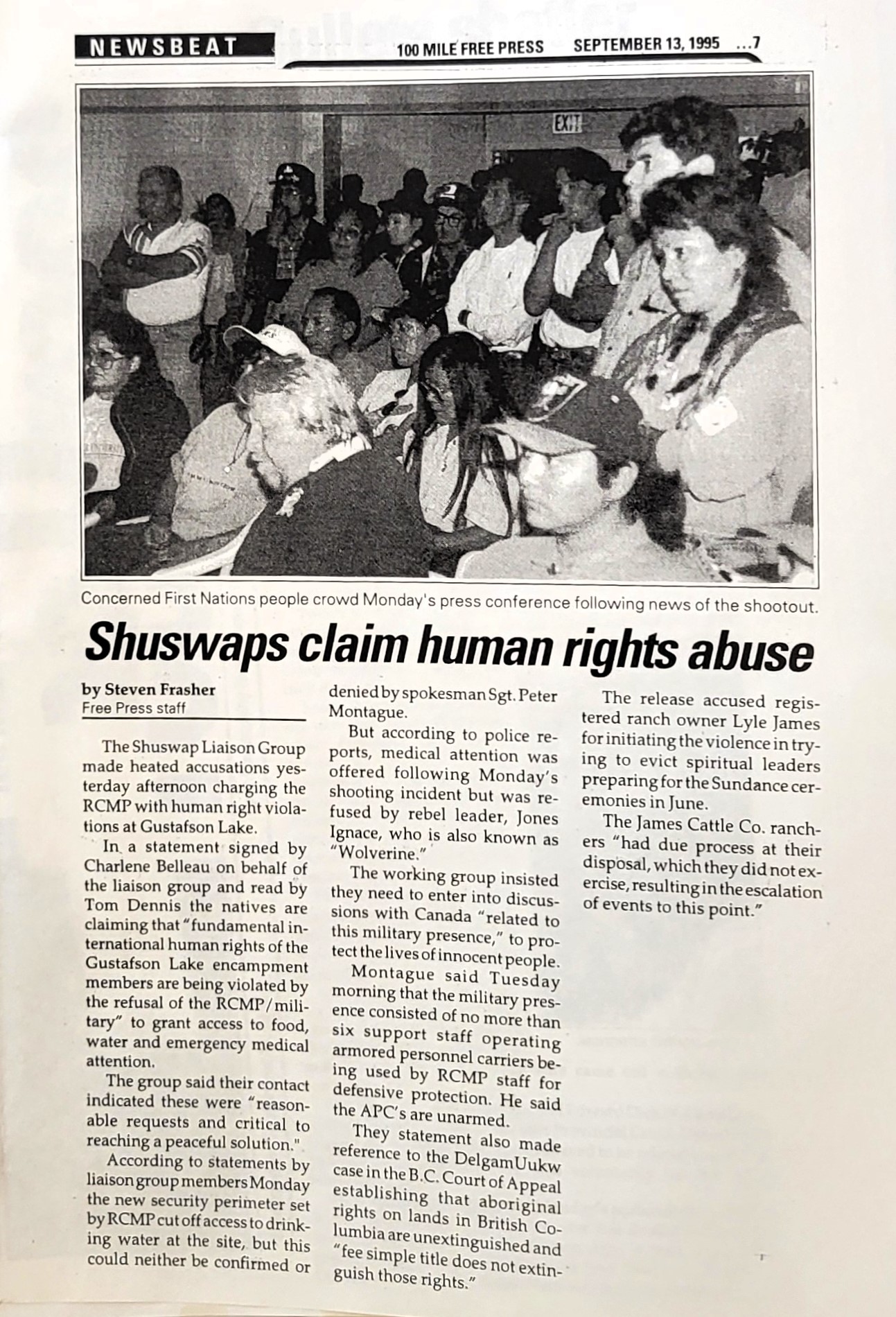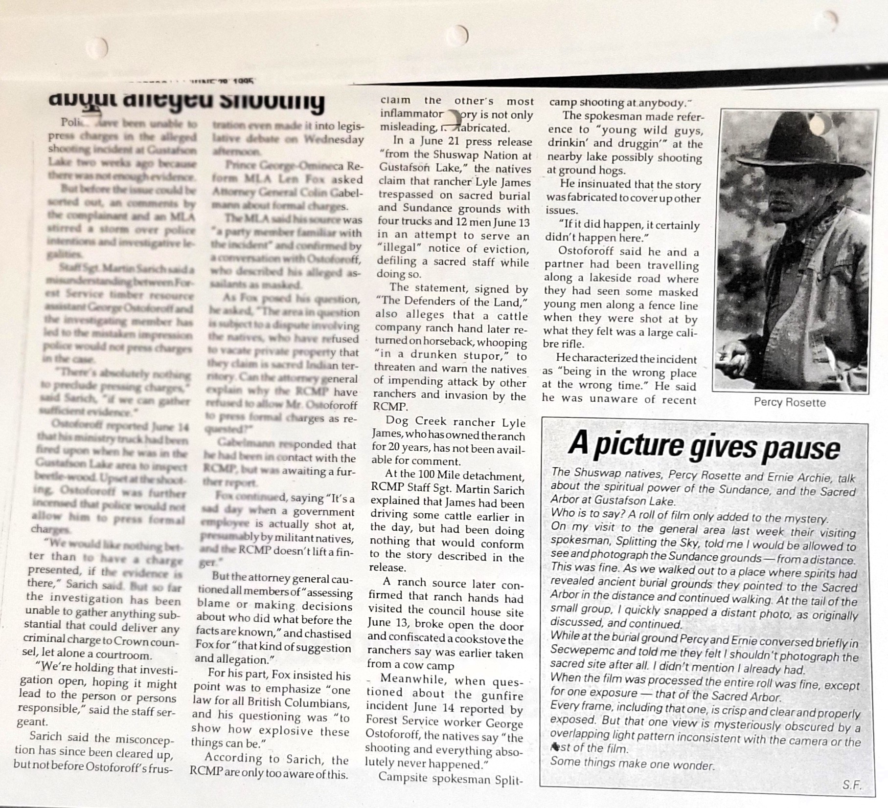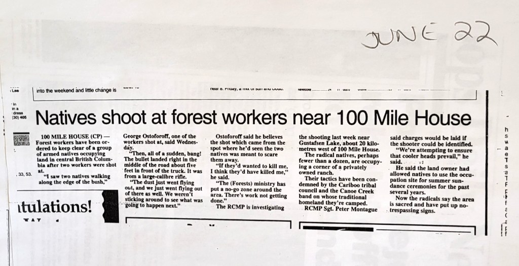 | Forestry workers report being fired on “Natives shoot at forest workers,” Canadian Press, June 22 1995. “Forest workers have been ordered to keep clear of a group of armed natives occupying land in central British Columbia after two workers were shot at. “I saw two natives walking along the edge of the bush,” George Ostoroff, one of the workers shot at, said Wednesday. “Then, all of a sudden, bang! The bullet landed right in the middle of the road about five feet in front of the truck. It was from a large-calibre rifle.” Ostoroff said he believes the shot was meant to scare them away. “If they’d wanted to kill me, I think they’d have killed me,” he said. Note: This incident was specifically denied by people at The Sundance camp. No evidence was ever produced. |
