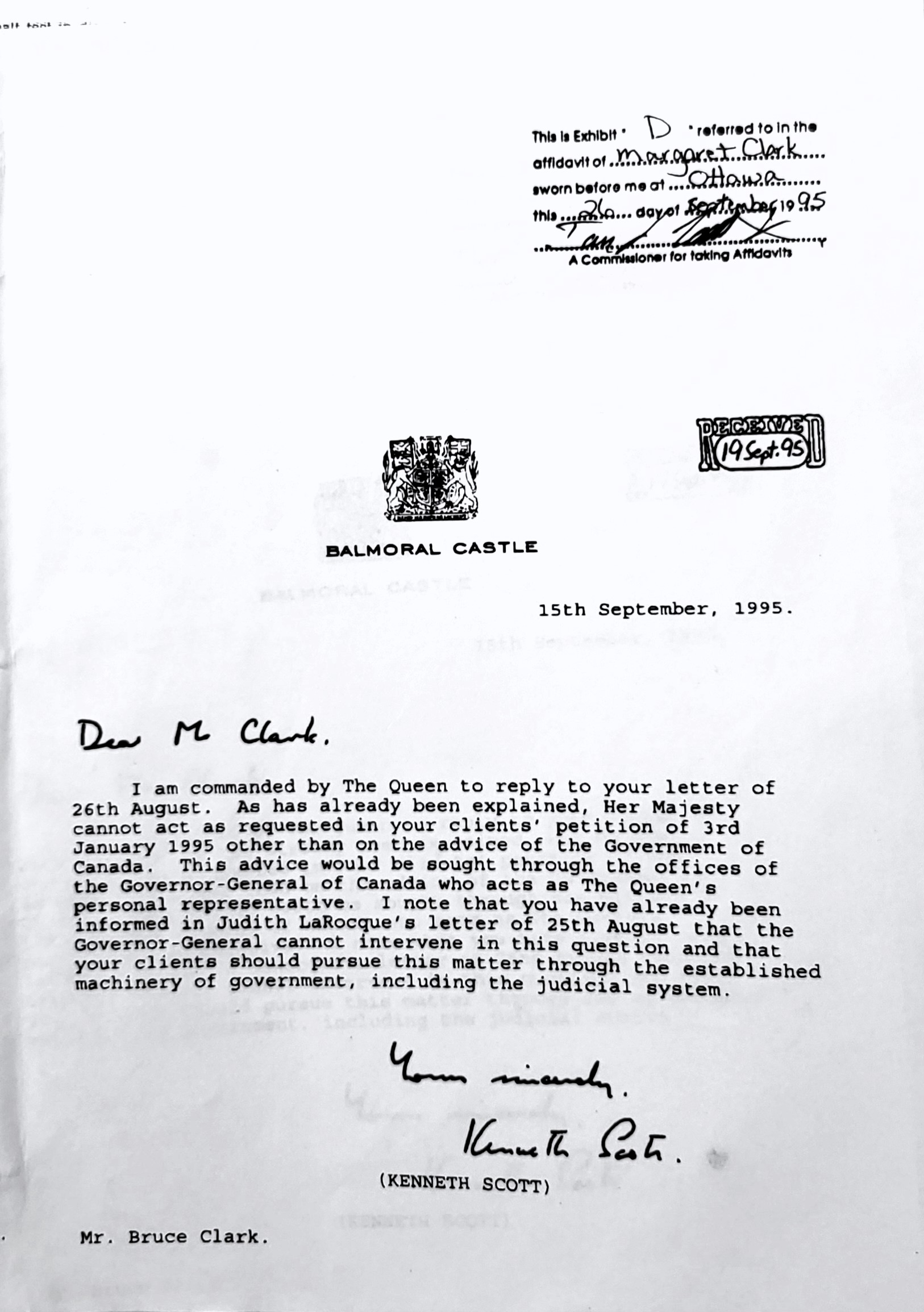LAMER C.J.: I must say, Mr. Clark, that in my twenty six (26) years as a judge I have never heard anything so preposterous and presented in such an unkind way. To call the judges of the Supreme Court of Canada and the nine hundred and seventy five (975) High Court judges of Canada accomplices to genocide is something preposterous. I do not accept that and I think you are a disgrace to the bar. The point is you have my opinion and you are lucky I am just proceeding to opinions at this stage.