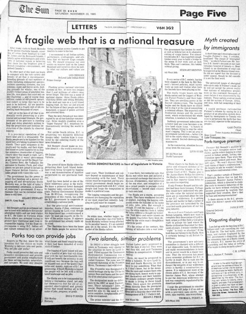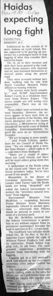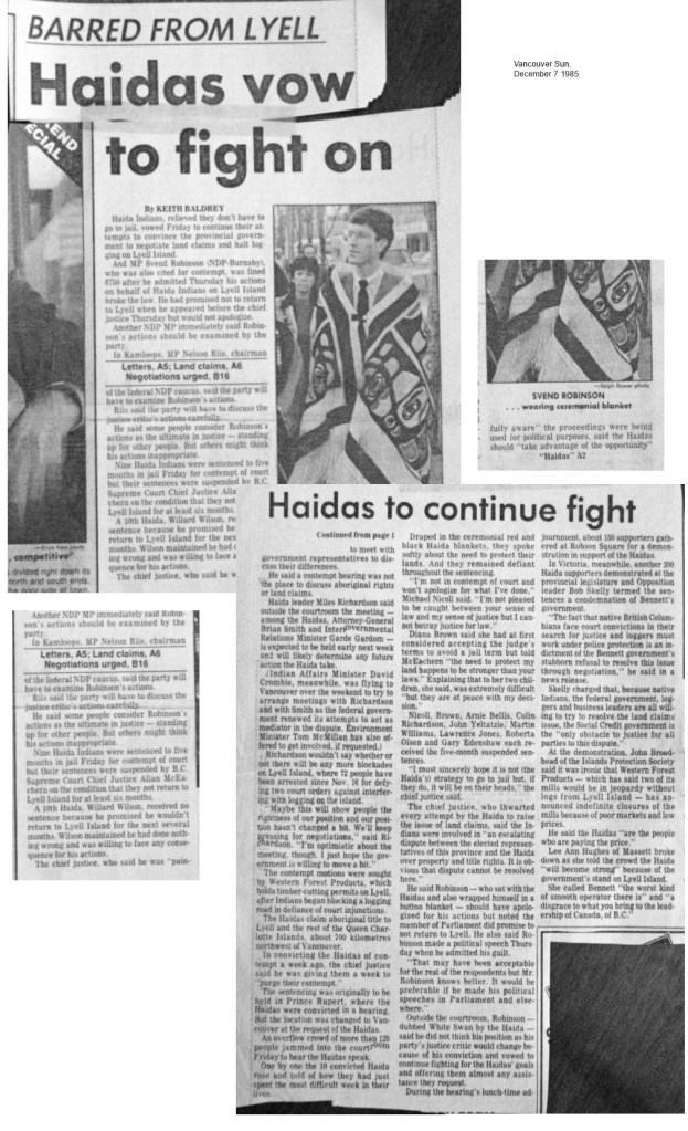 1985 Dec 7. “Barred from Lyell Haidas vow to fight on” VanSun.KeithBaldrey