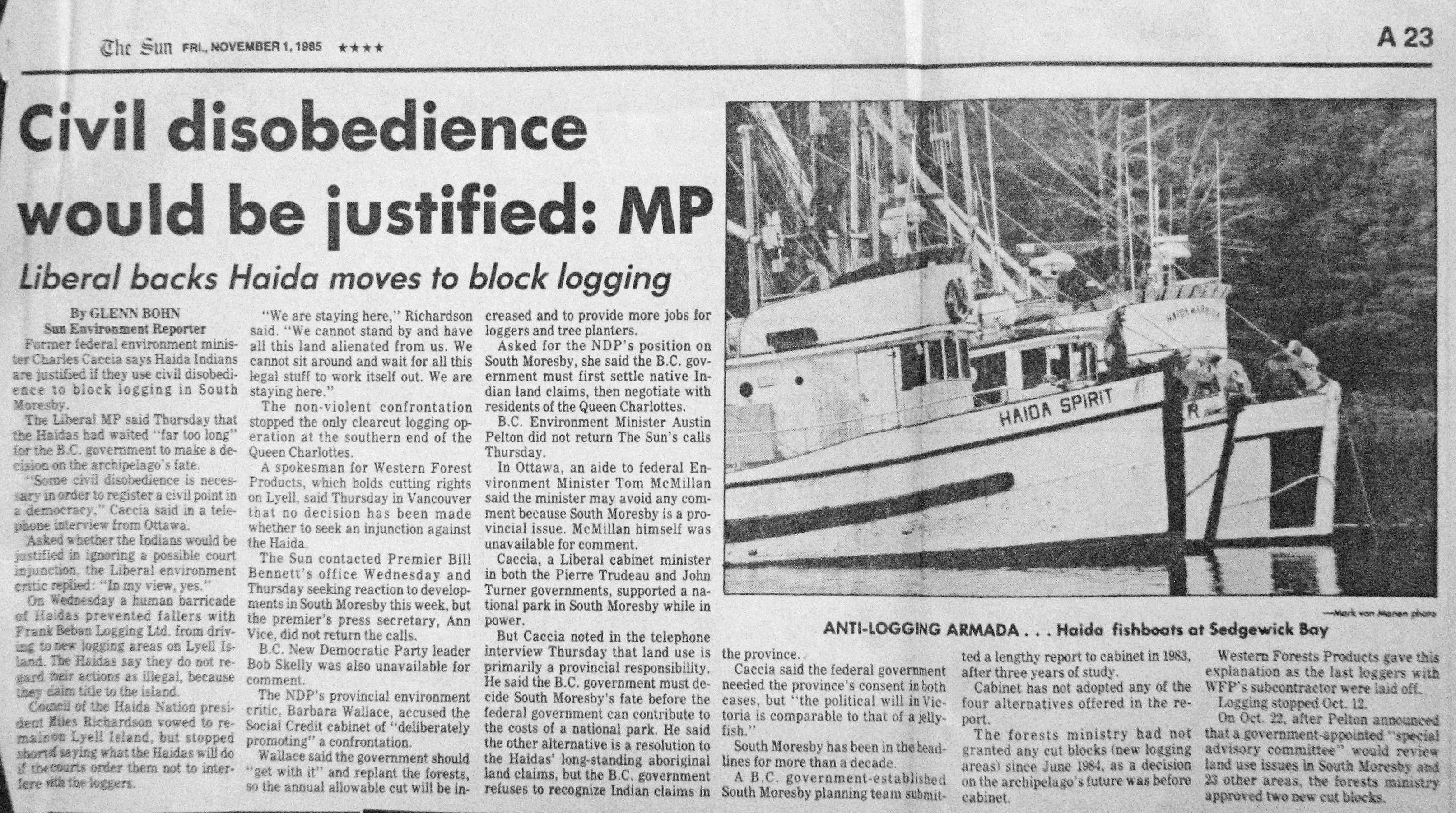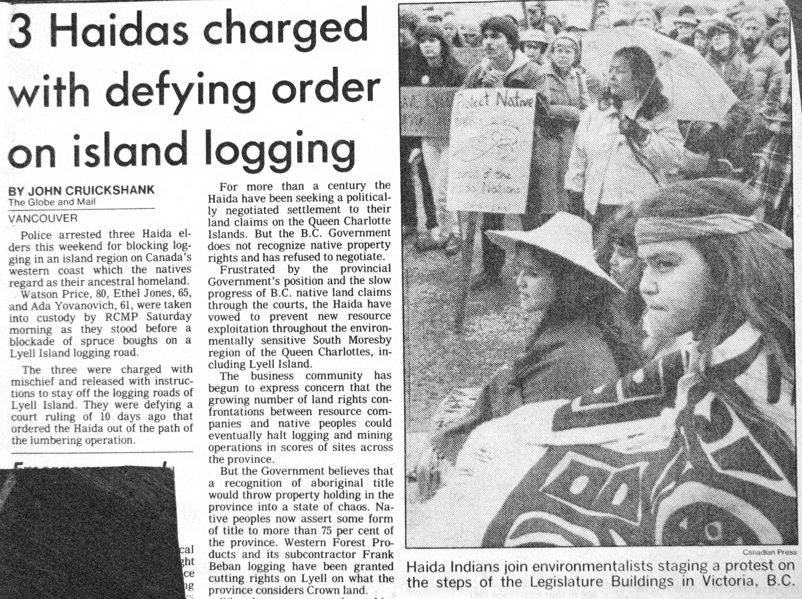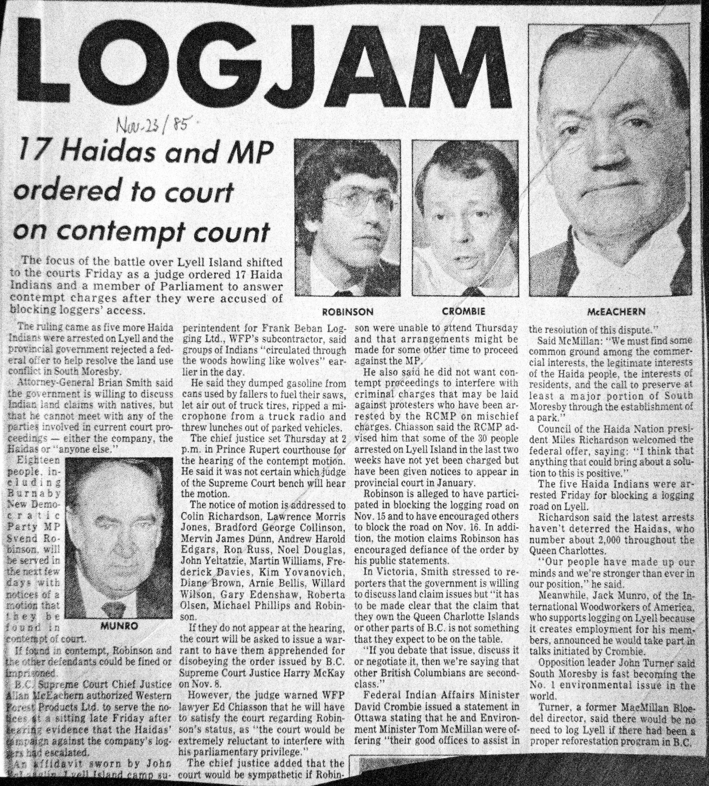 1985 Nov 23. “17 Haidas and MP ordered to court on contempt count” Lyell Island TheProvince