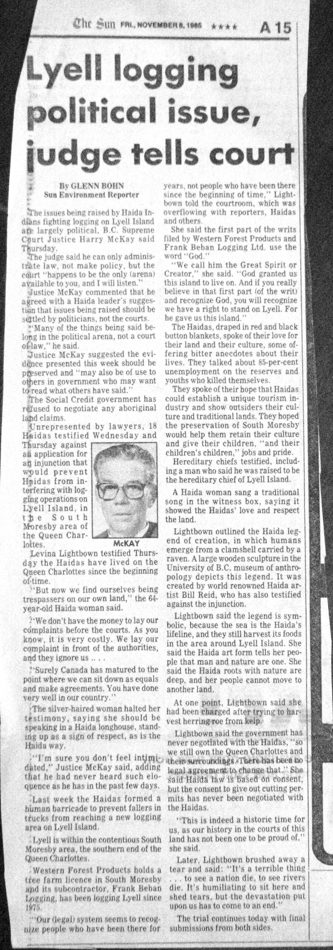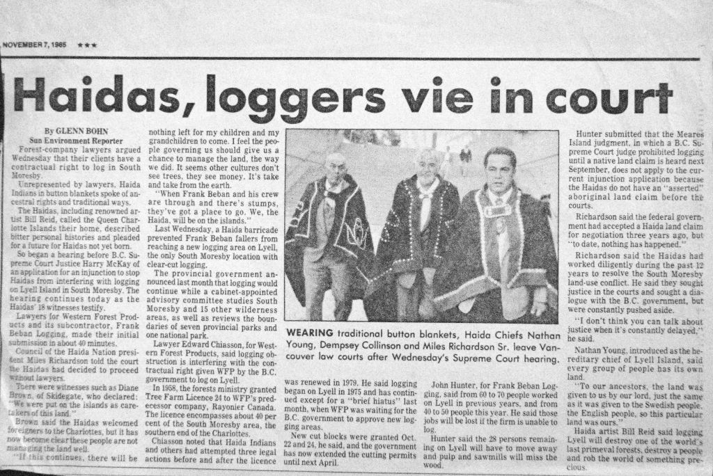1985 Nov 7. “Haidas, loggers vie in court re. Lyell” VanSun.GlennBohn