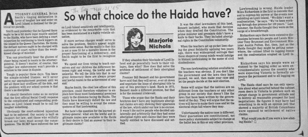 1985 Nov 21. “So what choice do the Haida have?” VanSun.MarjorieNichols