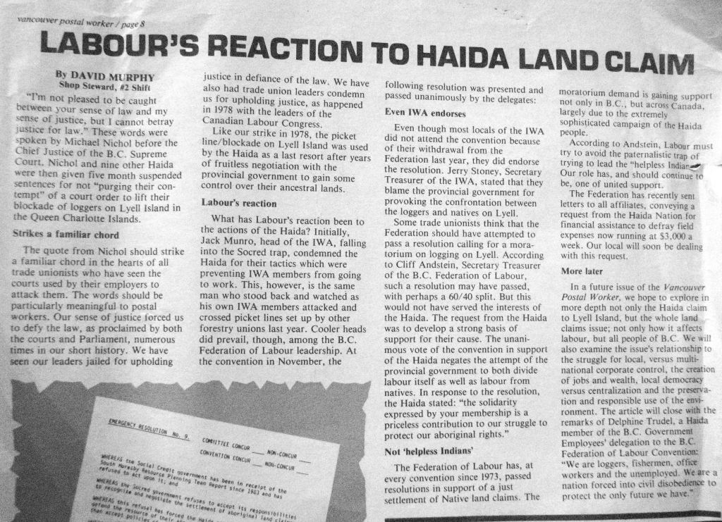 1987 “Labour’s reaction to Haida land claim” in The Vancouver Postal Worker