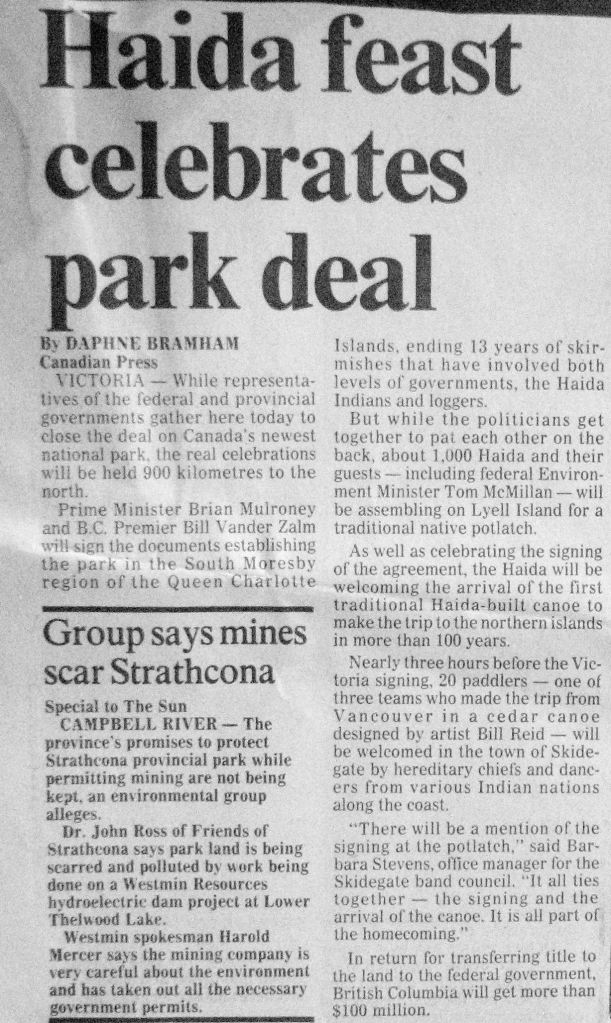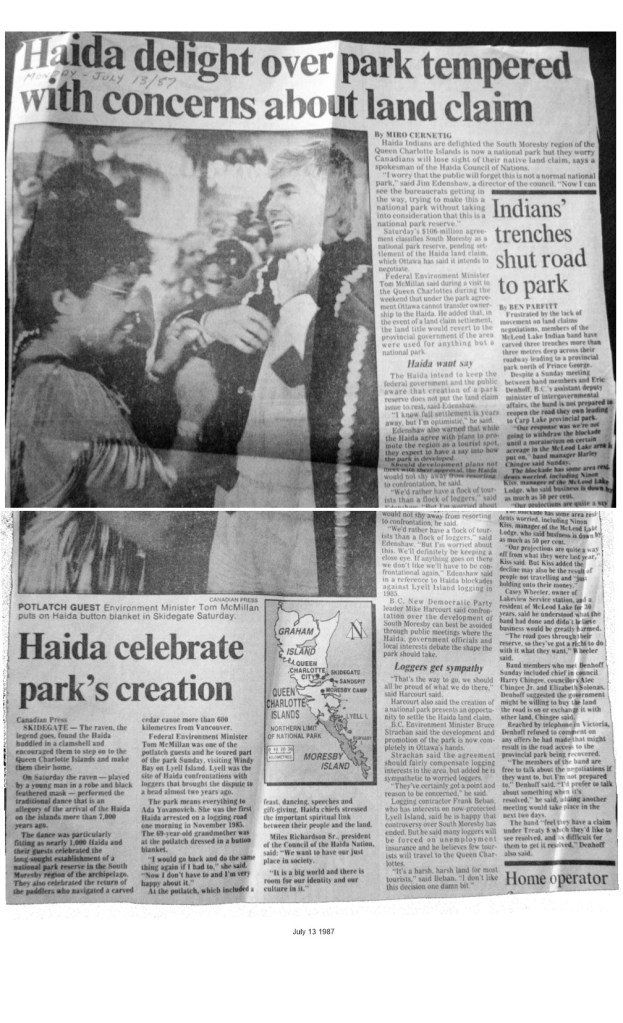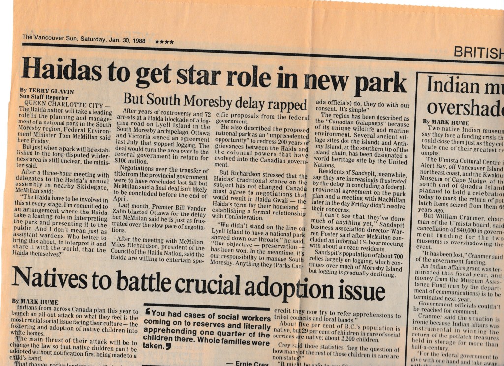 1988 Jan 30. SouthMoresby. “Haidas to get star role in new park.” VanSun/TerryGlavin