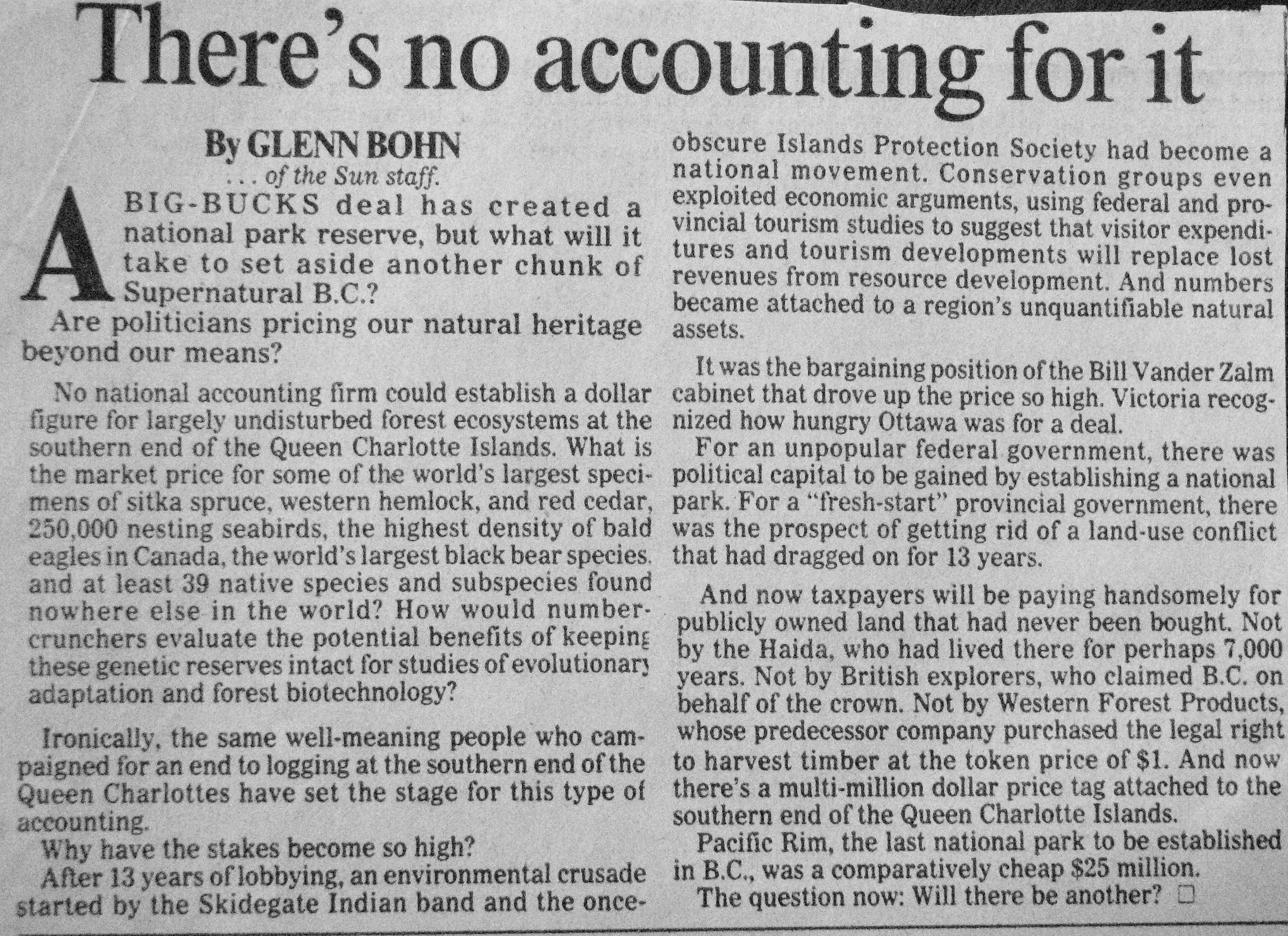 1987 re. Lyell Island park: “There’s no accounting for it” VanSun editorial GlennBohn