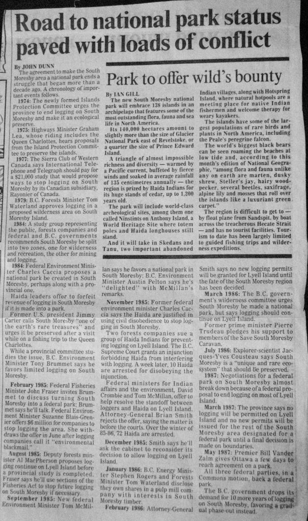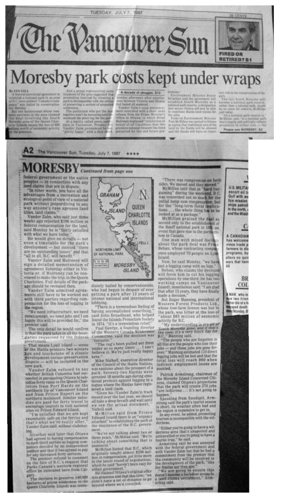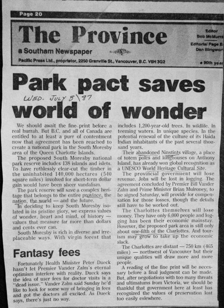 1987 July 8. “Park pact saves world of wonder”. South Moresby. TheProvince