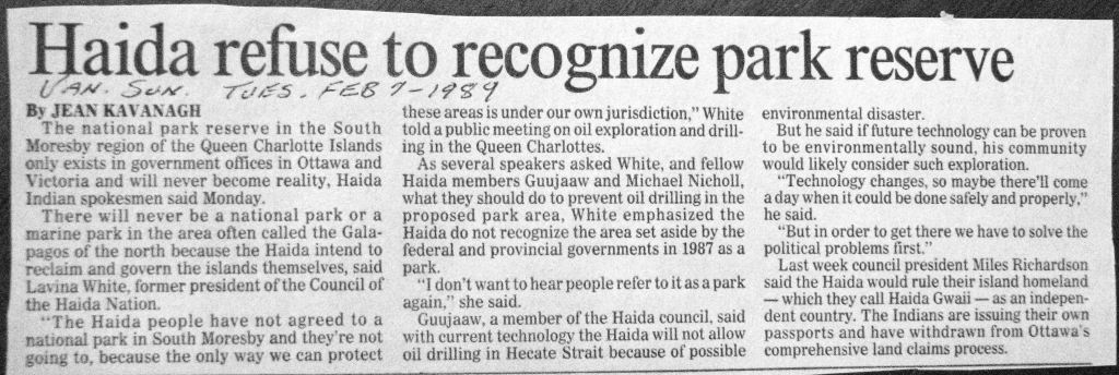 1989 Feb 7. “Haida refuse to recognize park reserve.” VanSun.JeanKavanagh