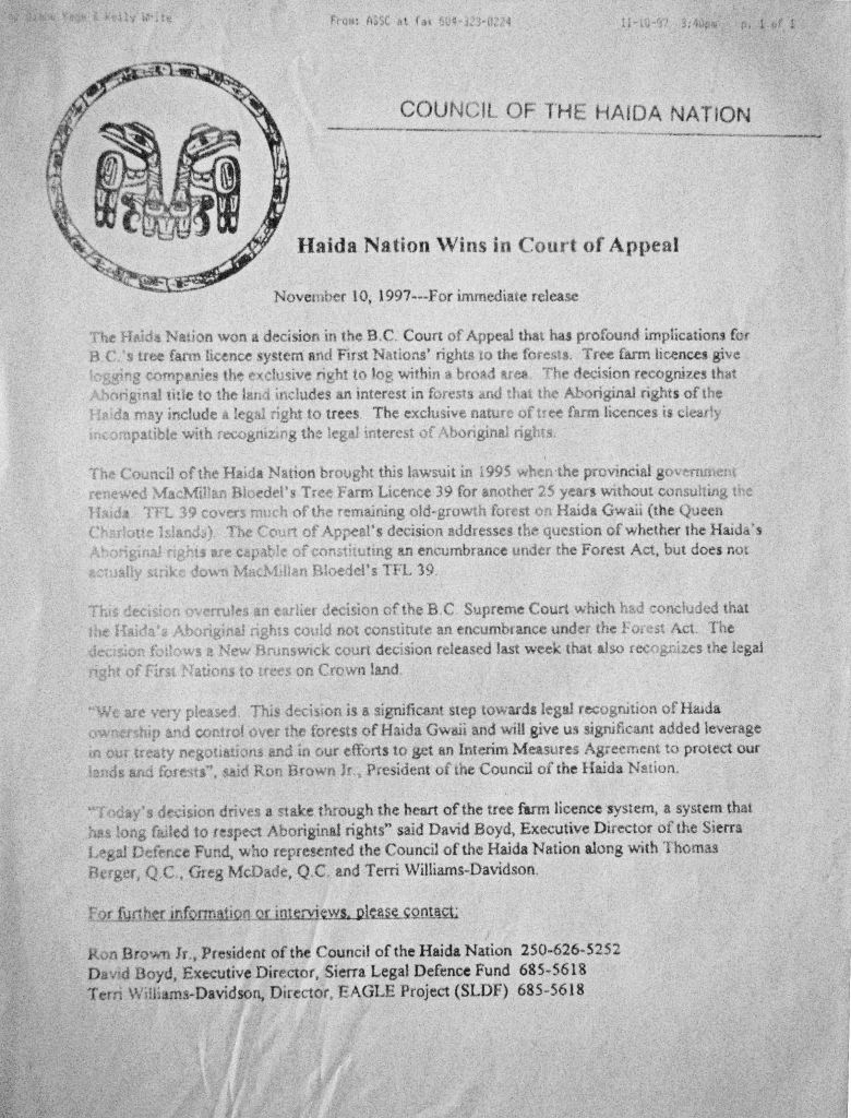 1997 Nov 10. CHN press release- Haida Nation wins in court of appeal