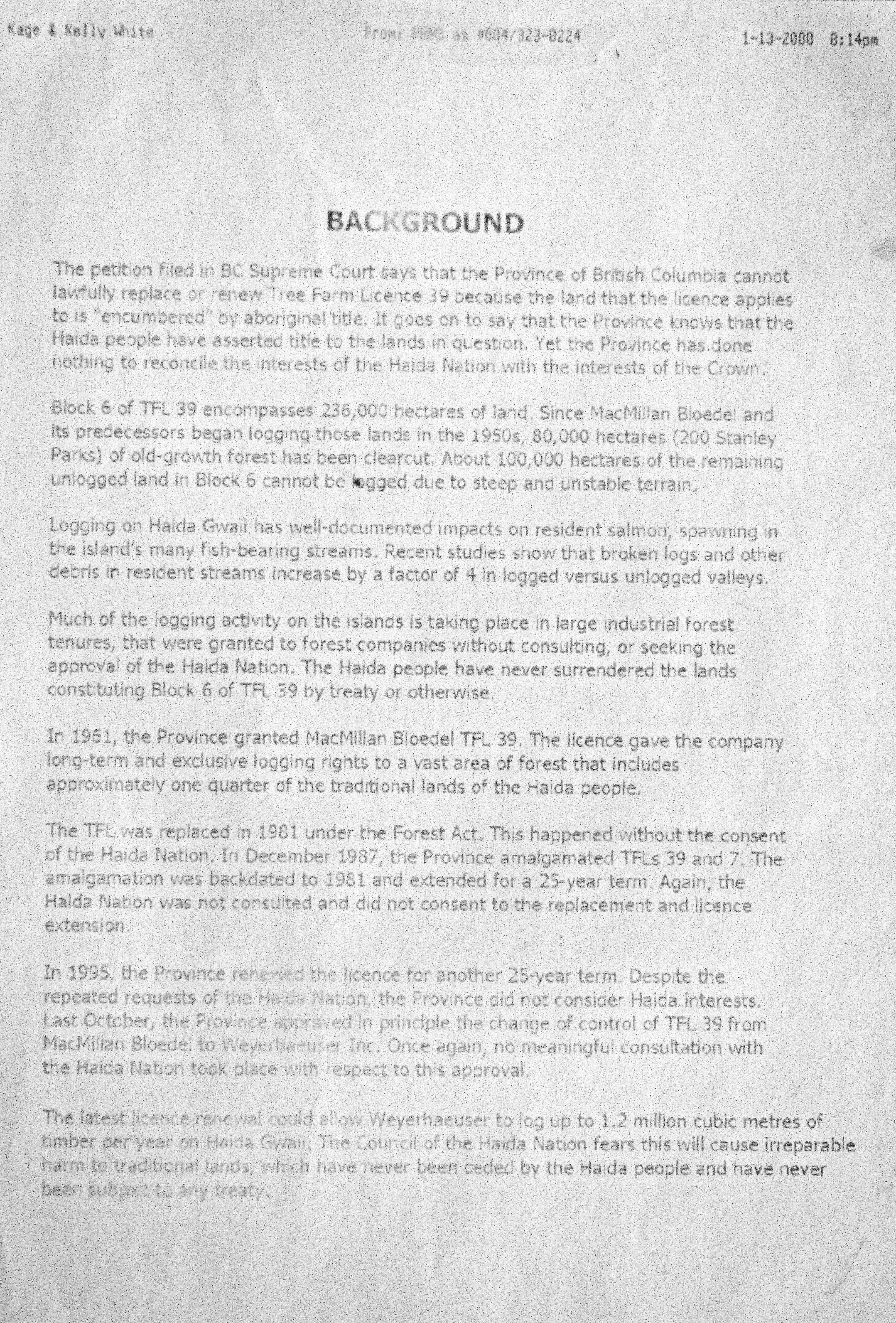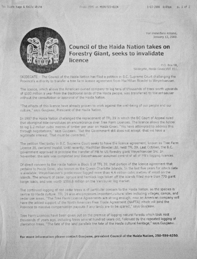 2000 Jan 13. CHN press release- Council of the Haida Nation takes on forestry giant to invalidate license