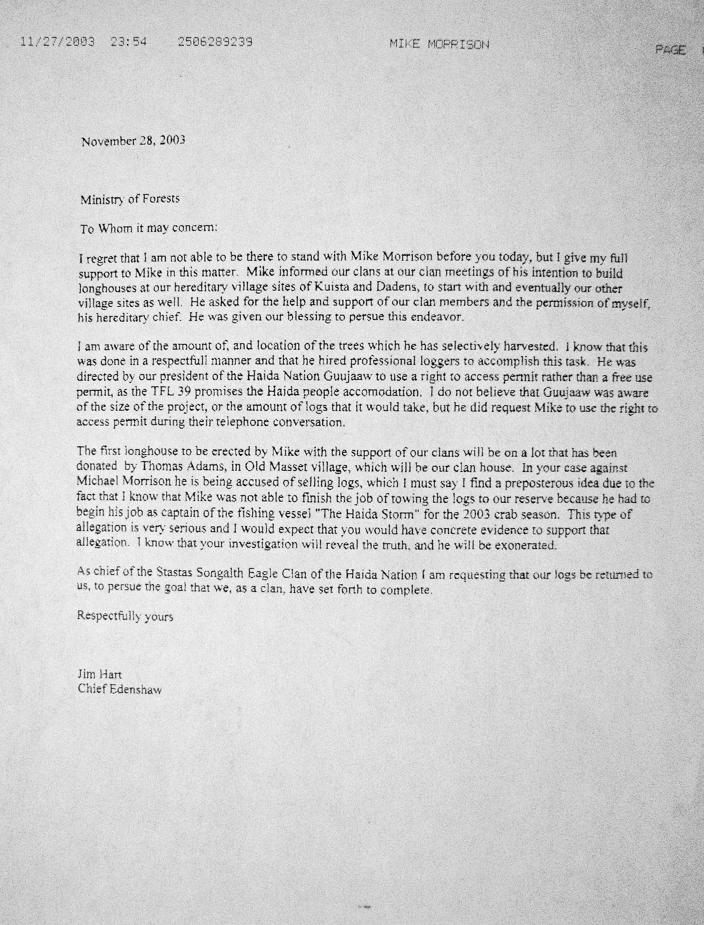 1990s – Letter to Minister re Forest Practice Code. Charlie Bellis. in Haida Laas magazine