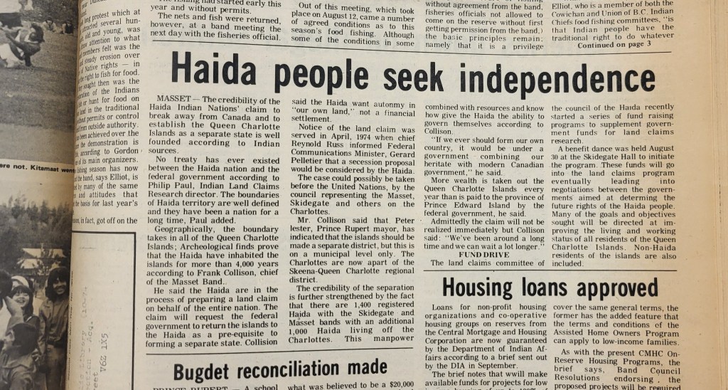 1987 July 5. “Rogers predicts Haida better off talking land claims with Ottawa” VanSun.TomBarrett